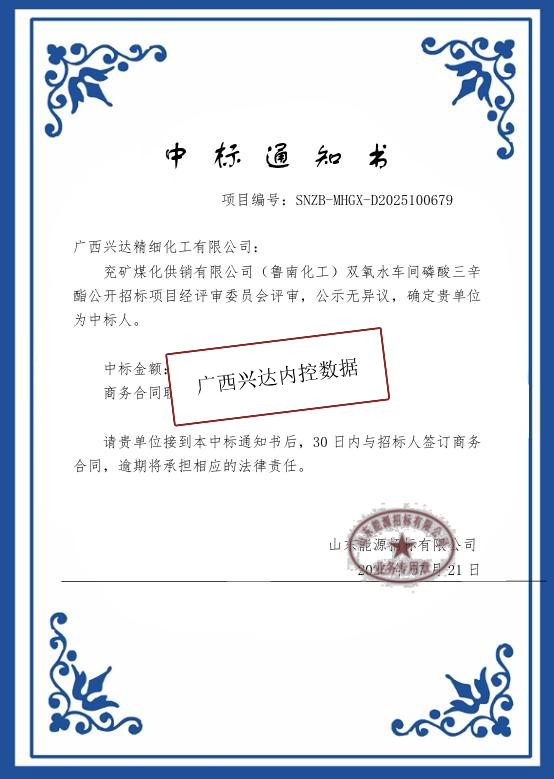 广西兴达精细化工2025年第二次中标兖矿煤化供销有限公司(鲁南化工) 双氧水车间磷酸三辛酯公开招标项目,成为多家双氧水企业的磷酸三辛酯供应商,市场认可度持续提升。